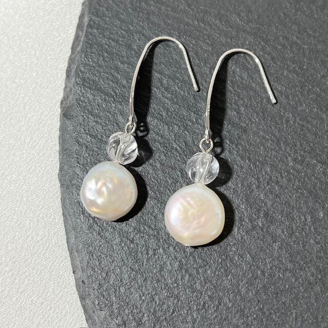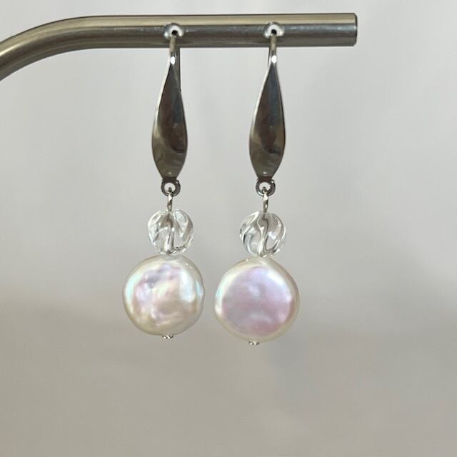 コインパールと呼ばれている淡水パールと、水晶を使った上品なピアスです。