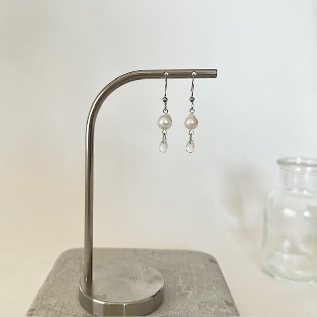 ホワイト淡水パールとドロップ形のチェコビーズを使い、儚い大人のピアスに仕上げました。