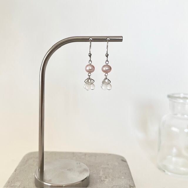 天然色ピンクベージュの淡水パールとドロップ形のチェコビーズを使った、エレガントなピアスです。