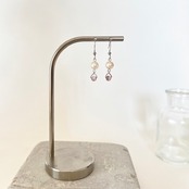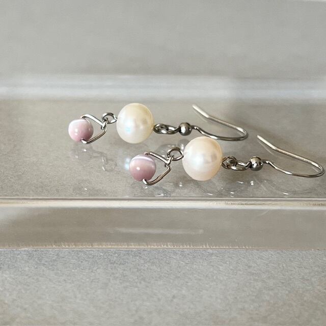 ミルキーホワイトの淡水パールとラベンダーピンクのキャッツアイを使った、上品なピアスです。