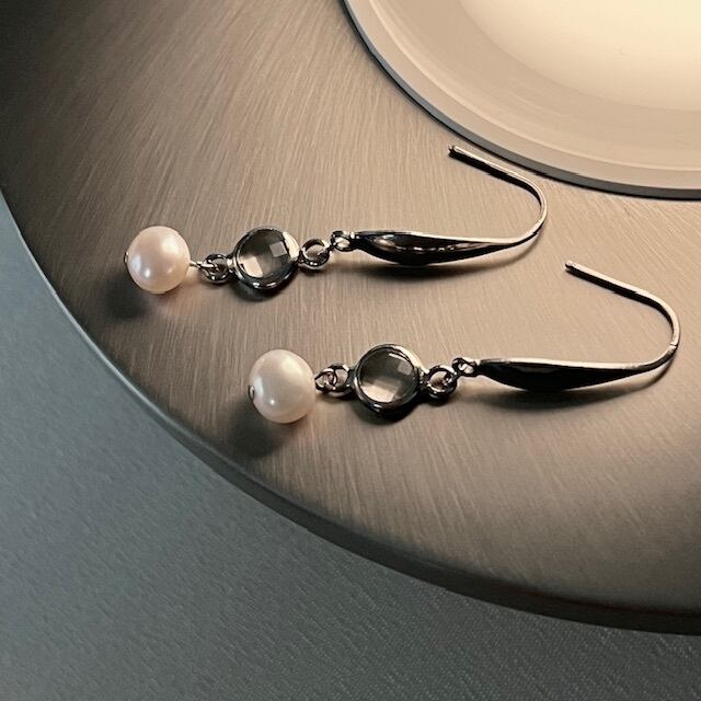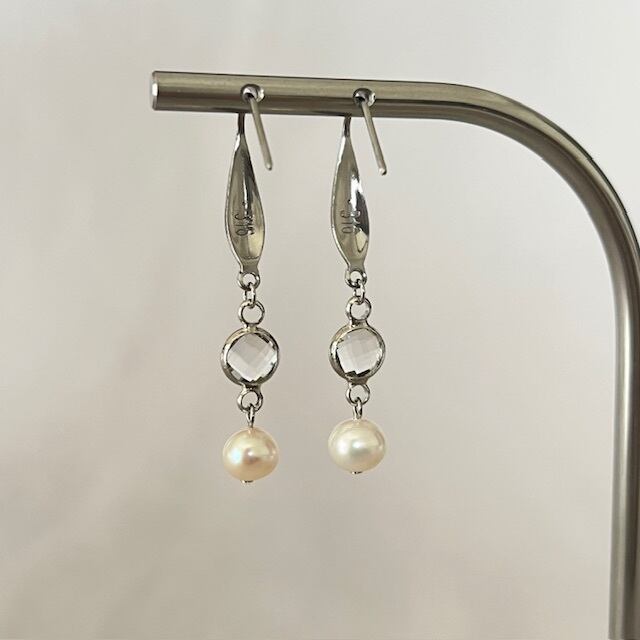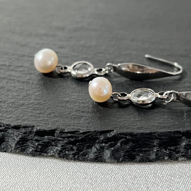 クリーム色の淡水パールと、円形フレームのガラス製クリスタルを使った、上品なピアスです。
