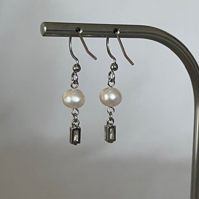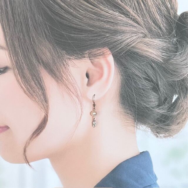 クリームホワイトの淡水パールとクリスタルを使った、上品なピアスです。
