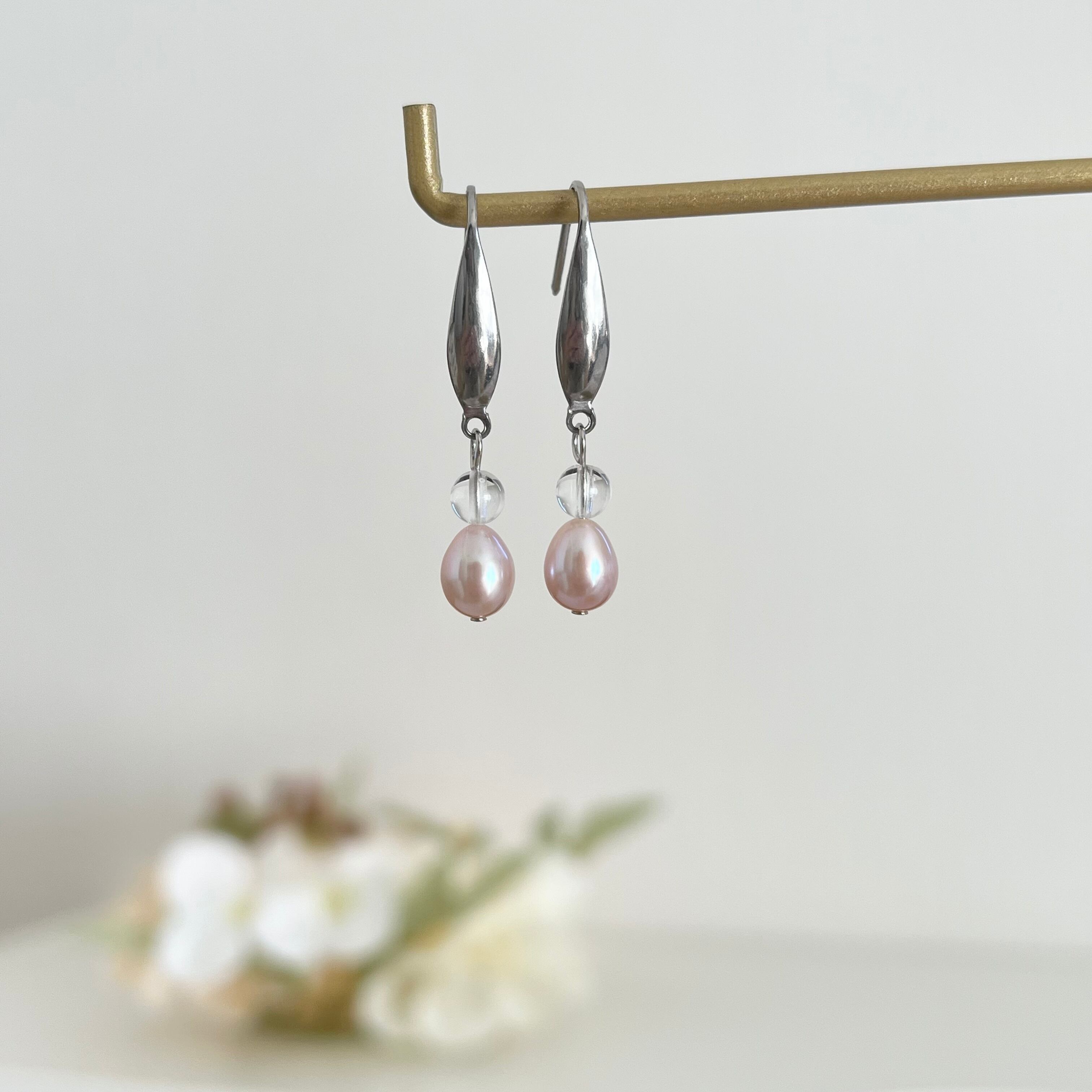 ラベンダーピンクの淡水パールに水晶を合わせて、上品な大人のピアスを作りました。
