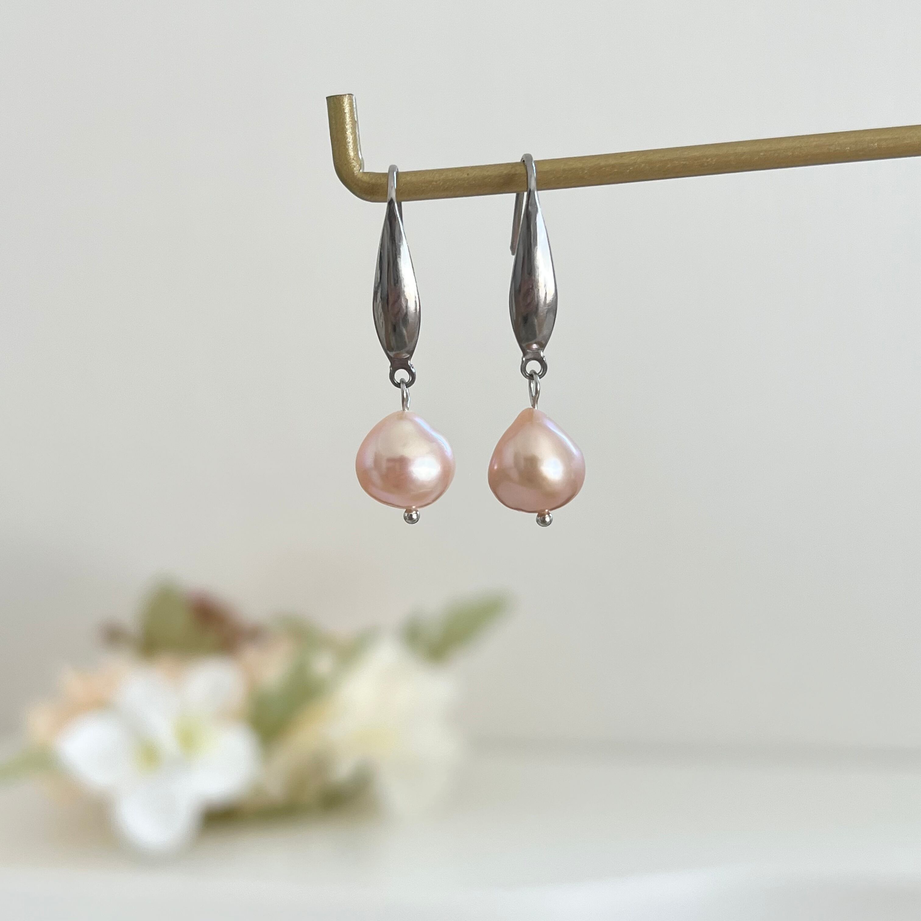ピーチピンクの淡水パール使った、上品な大人のピアスです。
