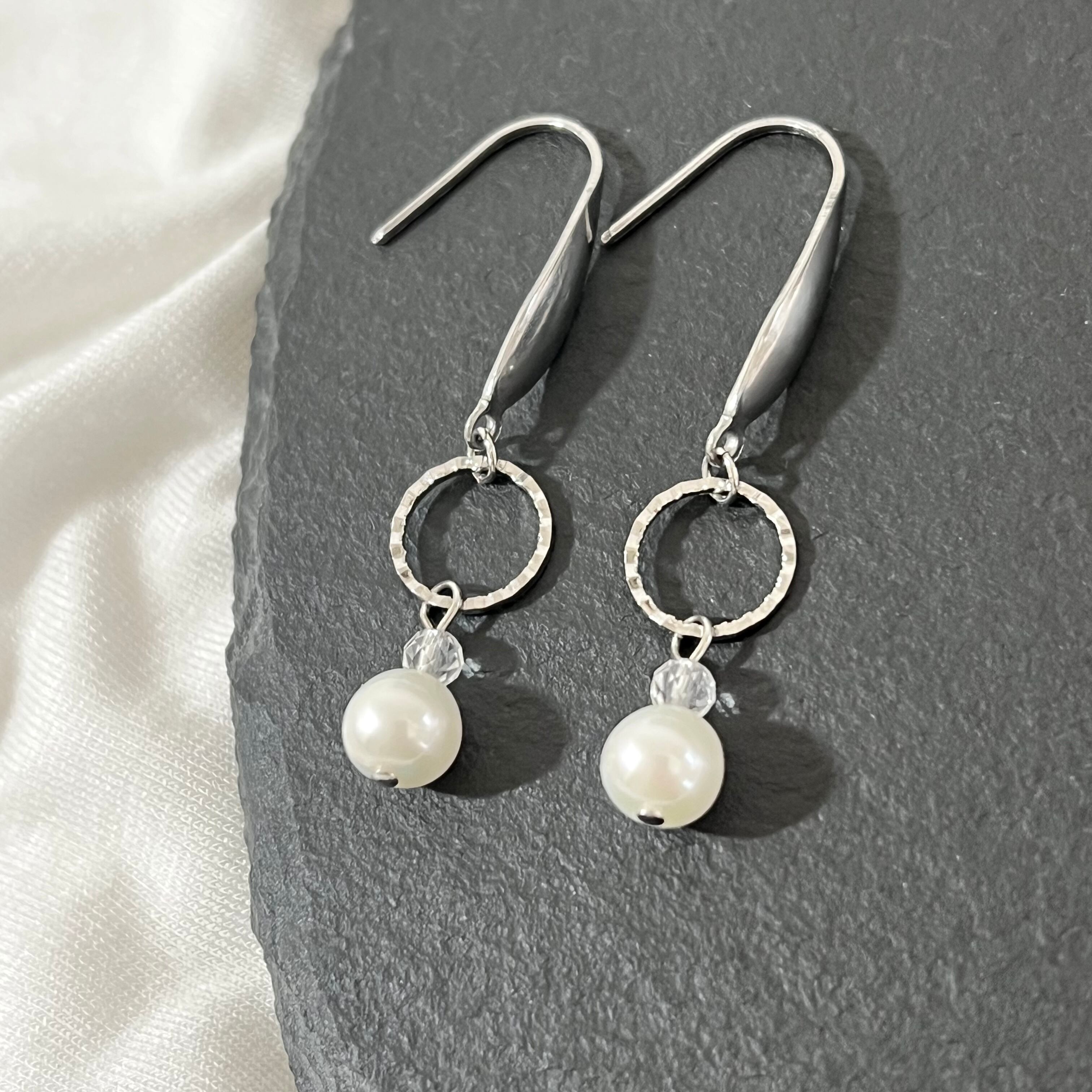 ホワイト淡水パールに、小さな水晶とリングを合わせて、上品な大人のピアスを作りました。